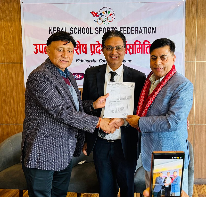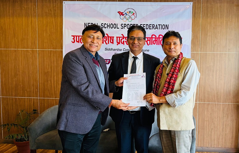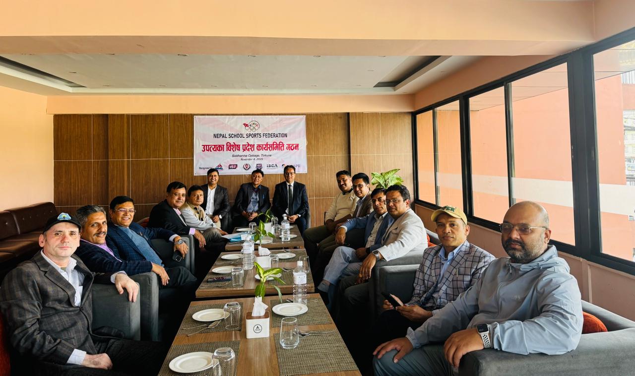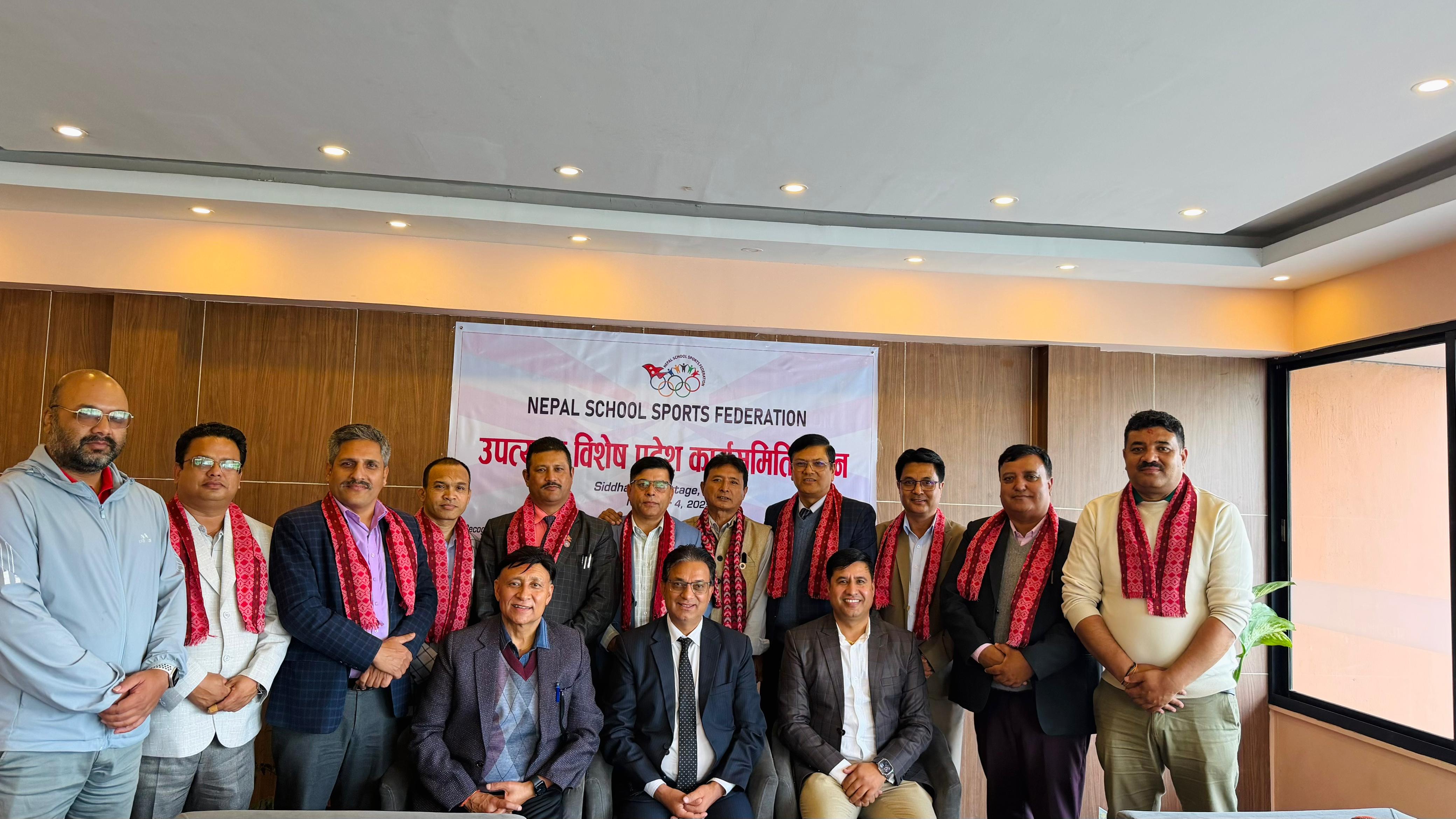 २०८२ कार्तिक १८, काठमाण्डौ । नेपाल विद्यालय खेलकुद महासंघ र अन्तर्राष्ट्रिय विद्यालय खेलकुद महासंघको उद्देश्य एवम् नियम अन्तर्गत रही विद्यालयस्तरको सम्पूर्ण खेलहरुको गतिविधिहरु सुचारु रुपले सञ्चालनका साथै विकास र बिस्तार गर्न श्री भुवनलाल श्रेष्ठको अध्यक्षतामा १५ सदस्यीय पदाधिकारी एवम् सदस्यहरु रहने गरी नेपाल विद्यालय खेलकुद महासंघ “उपत्यका विशेष प्रदेश” तदर्थ कार्यसमिति गठन गरिएको छ ।