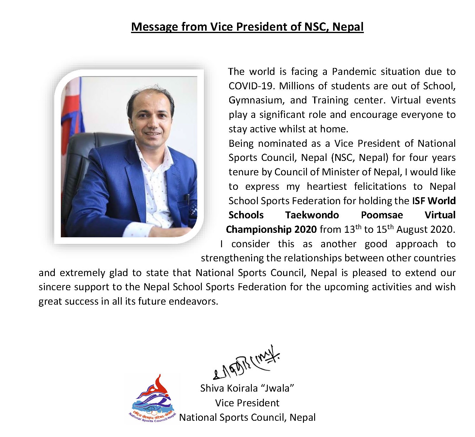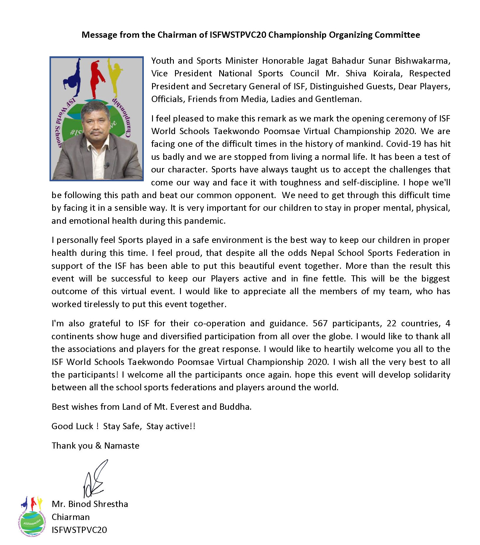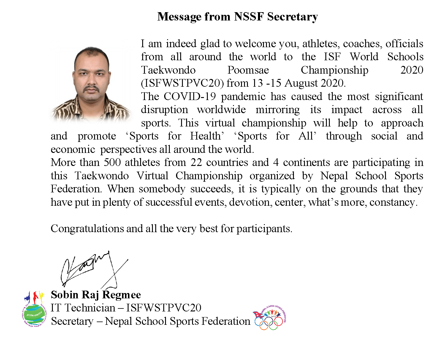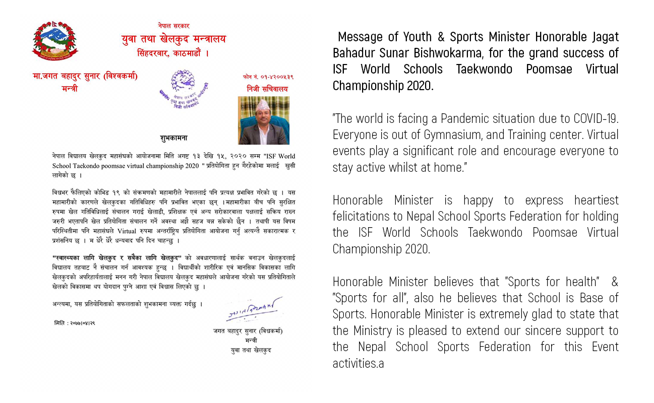 Thursday 13th of August 2020The ISF World Schools Taekwondo Poomsae Virtual Championship 2020 was an online event organized by the Nepal School Sports Federation with the approval and support of the International School Sport Federation (ISF). It took place in 2020 and involved over 480 young athletes from around the world. The event included both preliminary and final rounds, with competitors in the color belt category (12-14 years old) performing Taeguek 4 Jang and Taeguek 5 Jang, respectively. The championship aimed to promote school sports and connect young taekwondo athletes globally.