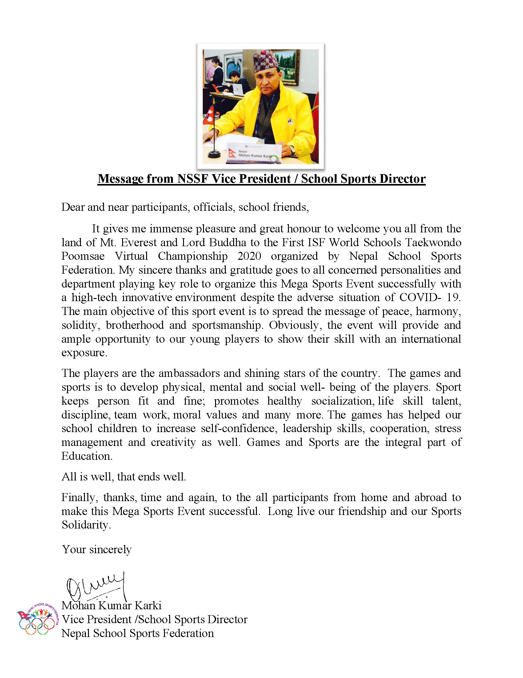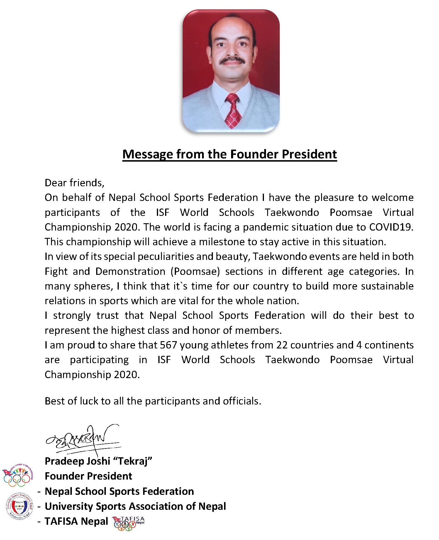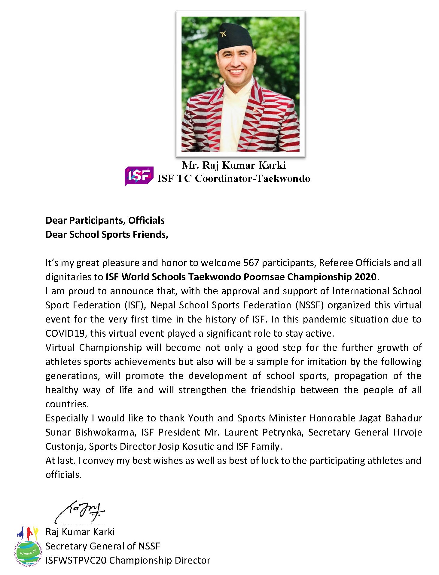 Thursday 13th of August 2020The ISF World Schools Taekwondo Poomsae Virtual Championship 2020 was an online event organized by the Nepal School Sports Federation with the approval and support of the International School Sport Federation (ISF). It took place in 2020 and involved over 480 young athletes from around the world. The event included both preliminary and final rounds, with competitors in the color belt category (12-14 years old) performing Taeguek 4 Jang and Taeguek 5 Jang, respectively. The championship aimed to promote school sports and connect young taekwondo athletes globally.