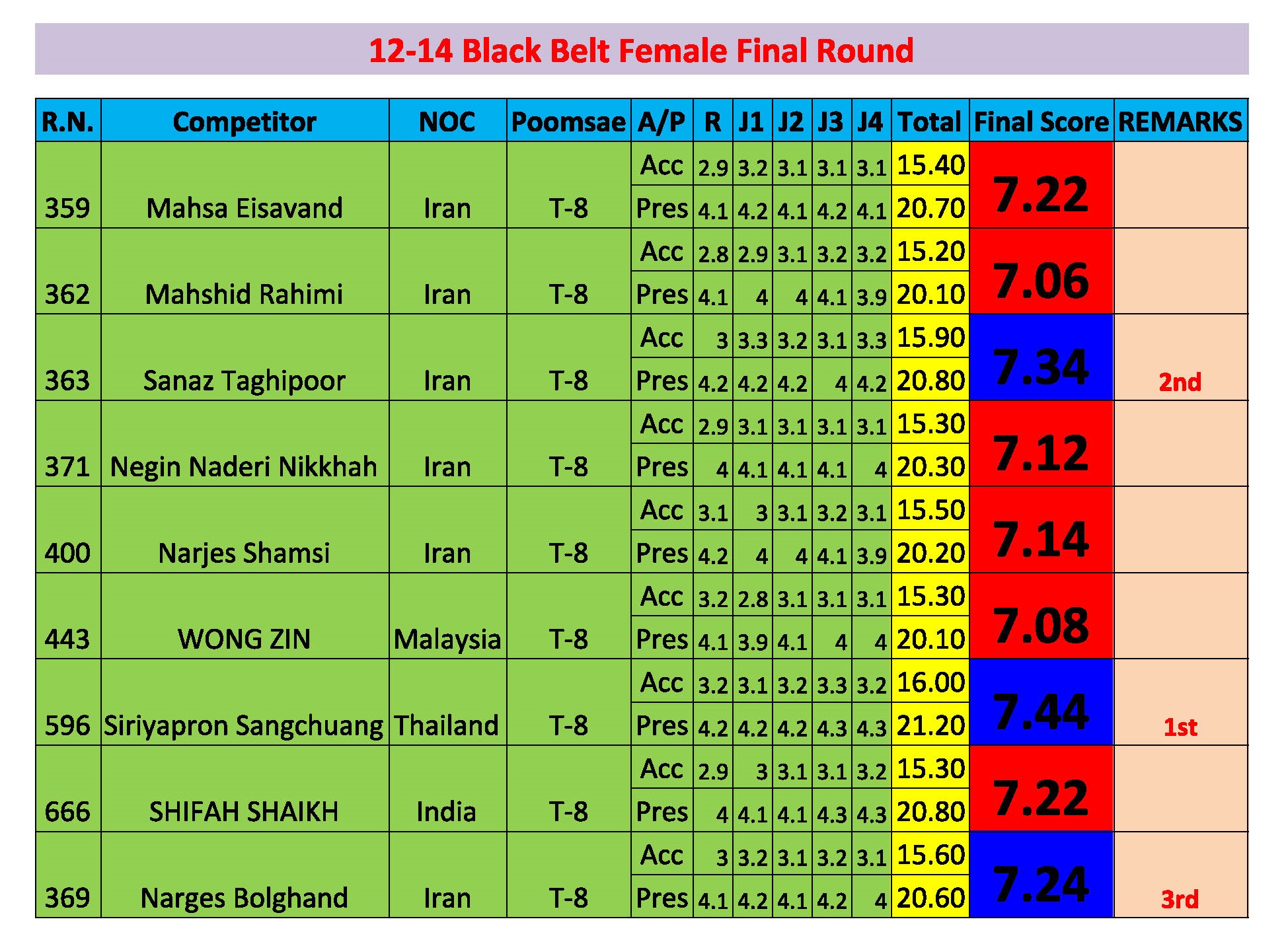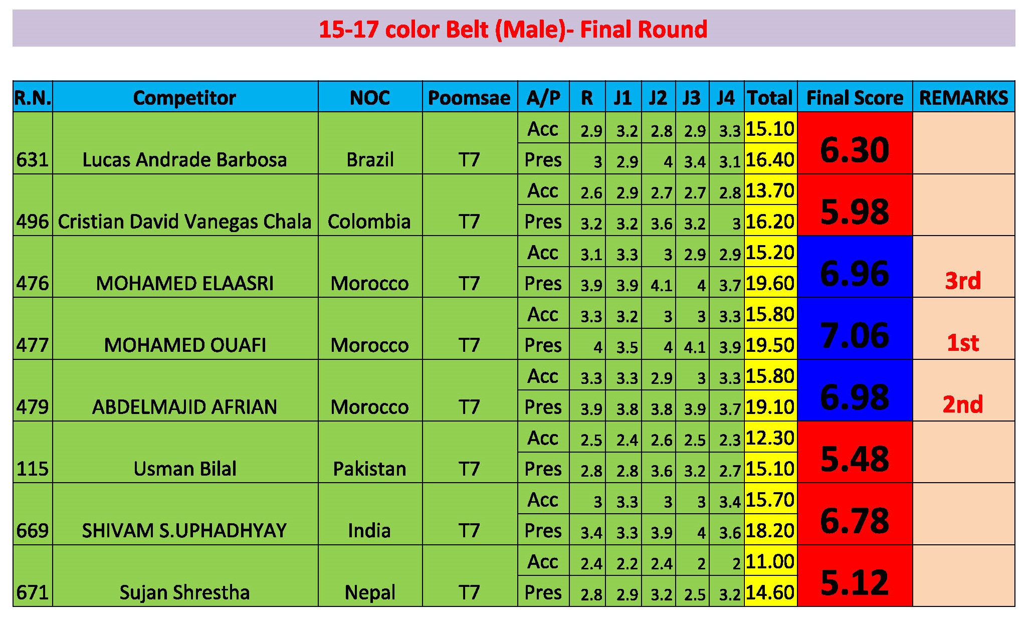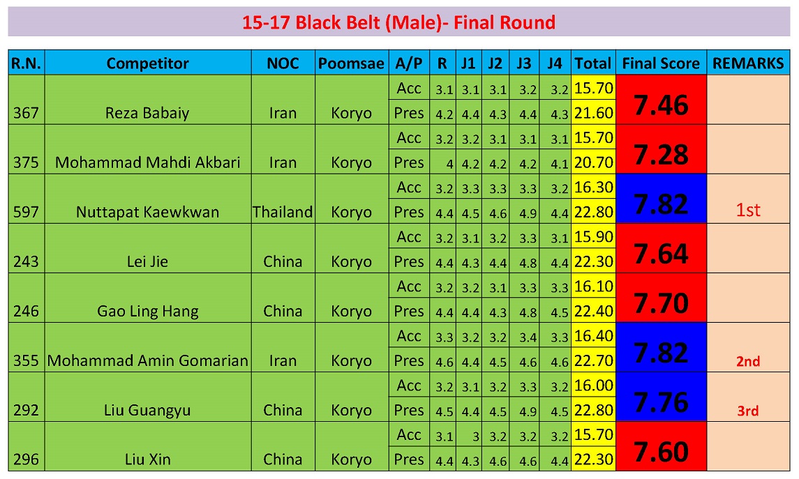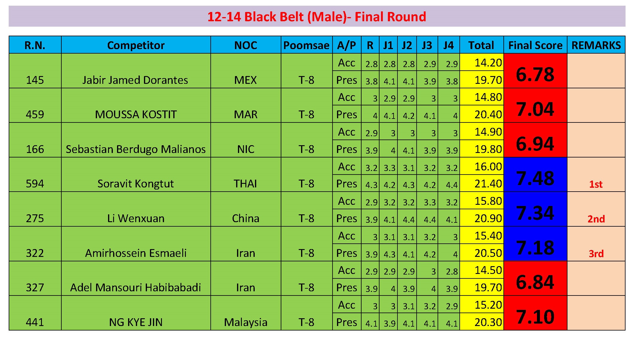- Rounds: Preliminary (Taeguek 4 Jang), Final (Taeguek 5 Jang)
