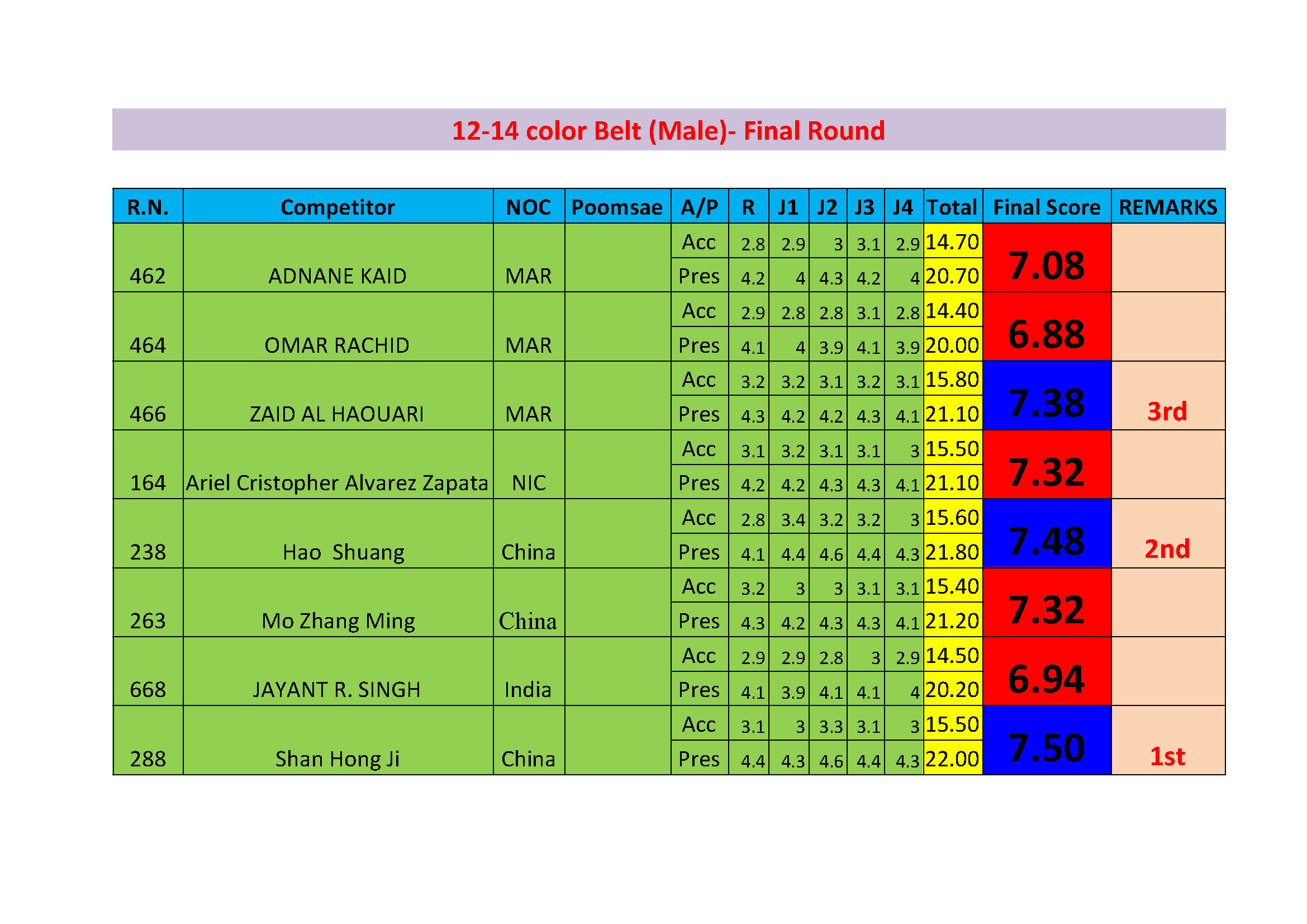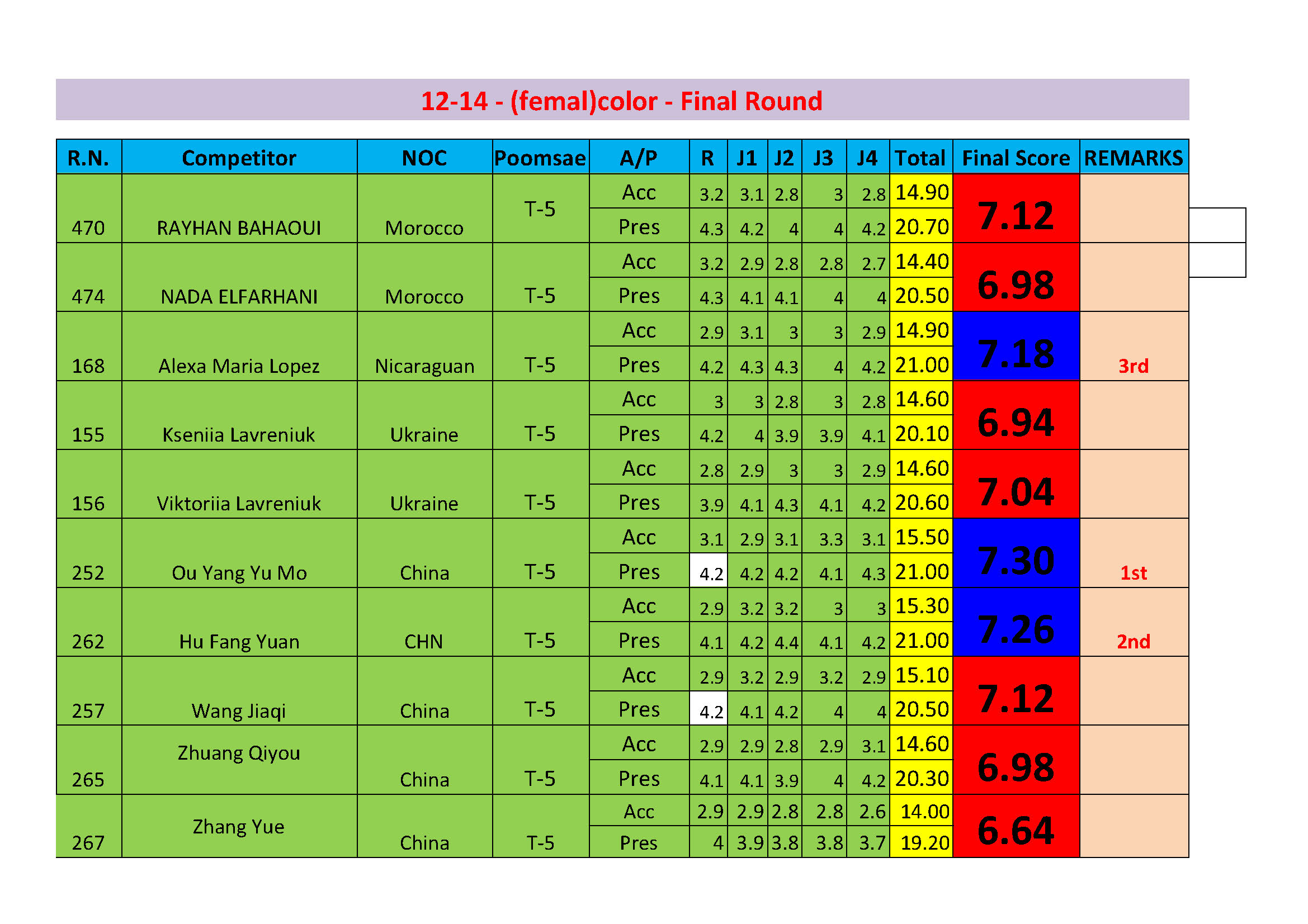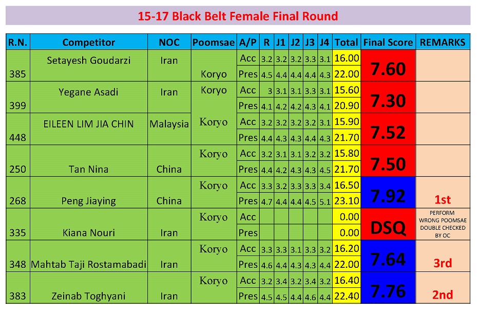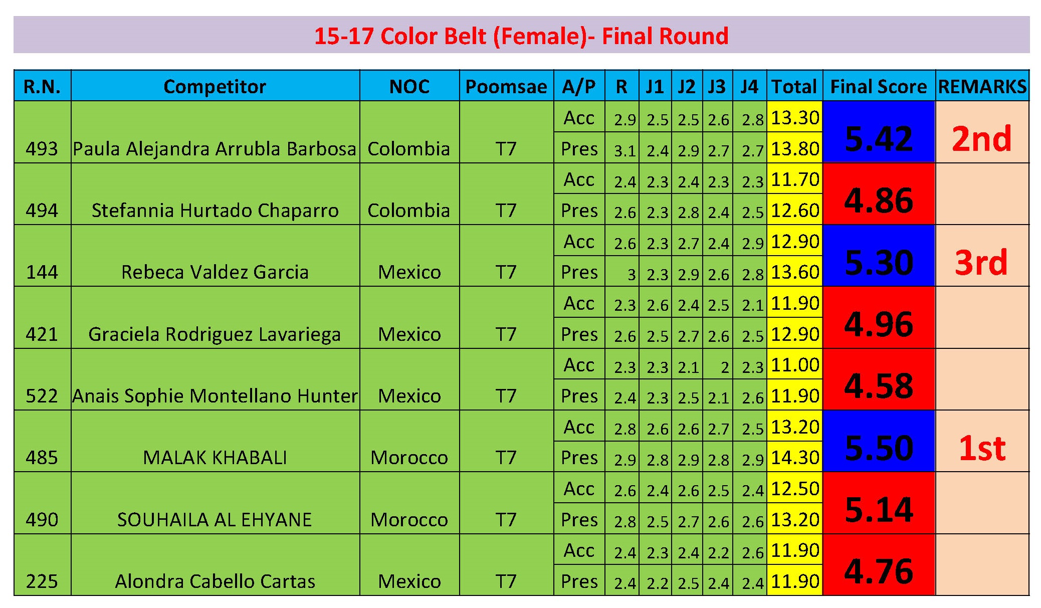 - Rounds: Preliminary (Taeguek 4 Jang), Final (Taeguek 5 Jang)